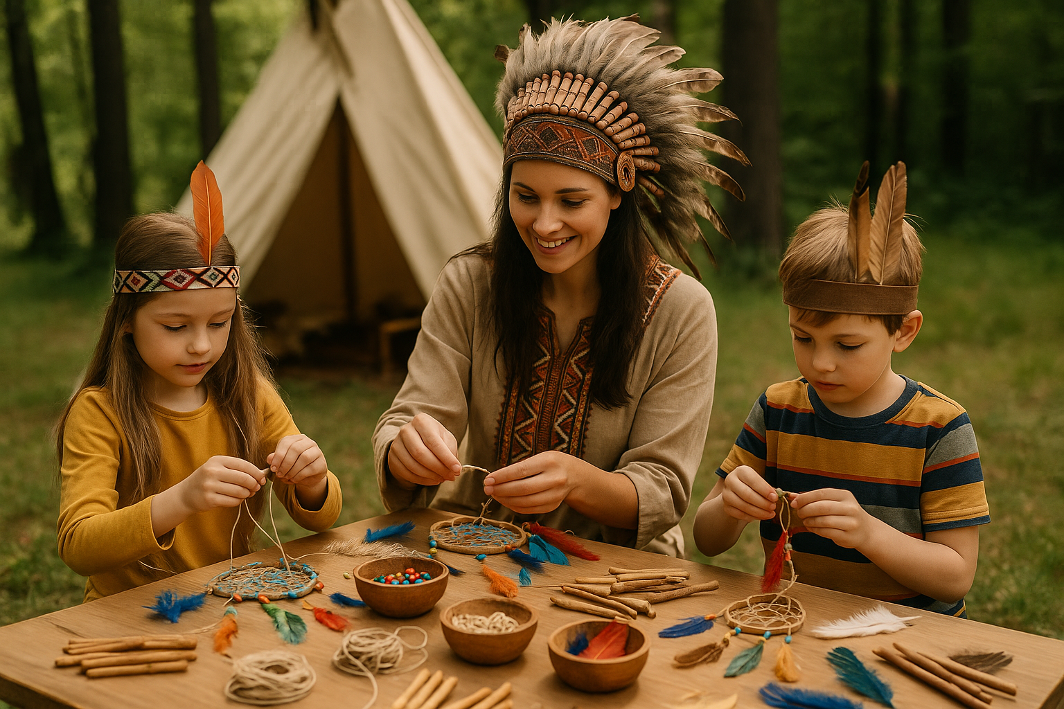 Warsztaty rękodzielnicze stanowią integralną część programu pobytu w Wiosce Kiraki. Dzieci wykonują własne prace inspirowane naturą oraz elementami indiańskiej symboliki, pracując z prostymi materiałami i poznając znaczenie wybranych znaków.